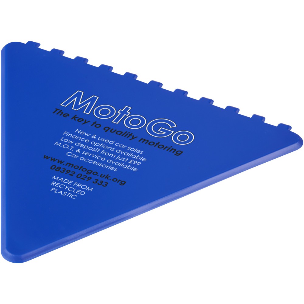 Háromszög alakú jégkaparó nagy emblémázható felülettel. Az Egyesült Királyságban készült újrahasznosított műanyagból.