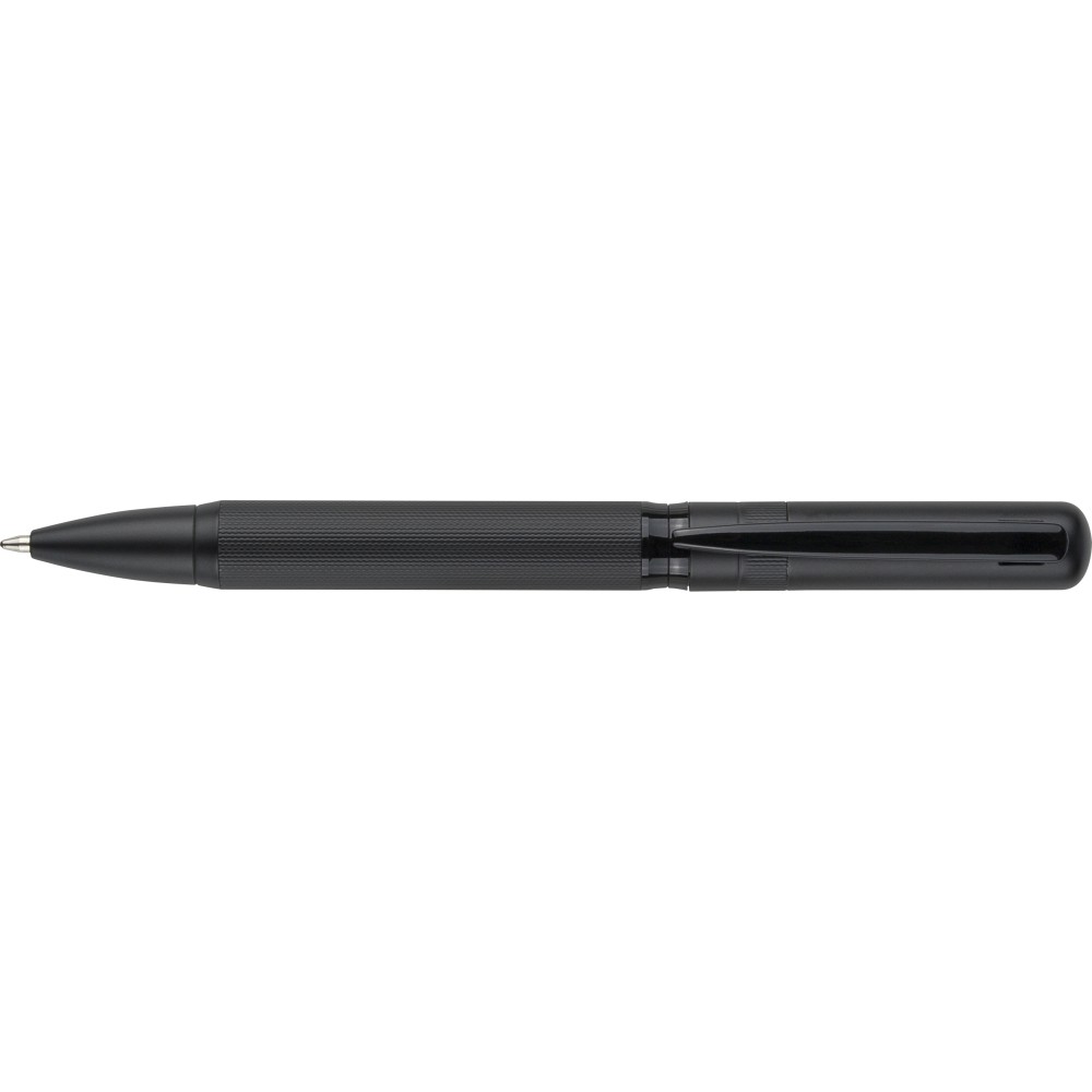 Ólommentes, környezetbarát Ecobrass rézötvözetből készült csavarós golyóstoll a toll színével harmonizáló fém klippel és forgó mechanizmussal. Kék színű, német Dokumental tollbetéttel felszerelve, megközelítőleg 1 000 méter íráshosszal. Darabonként fekete tolódobozba csomagolva.