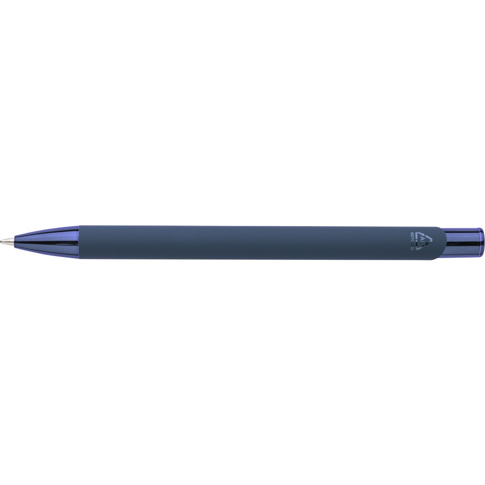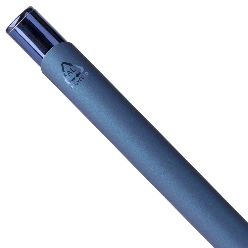 Újrahasznosított alumíniumból készült, gumírozott felületű golyóstoll, a toll színével harmonizáló UV-bevonatú műanyag és fém díszítéssel. Gravírozás után fényes tükörhatás jelenik meg. A tolltesten gravírozott recycled (újrahasznosított) alapanyagra utaló logó található. Megközelítőleg 800 méter íráshosszúságú, kék színű tollbetéttel.