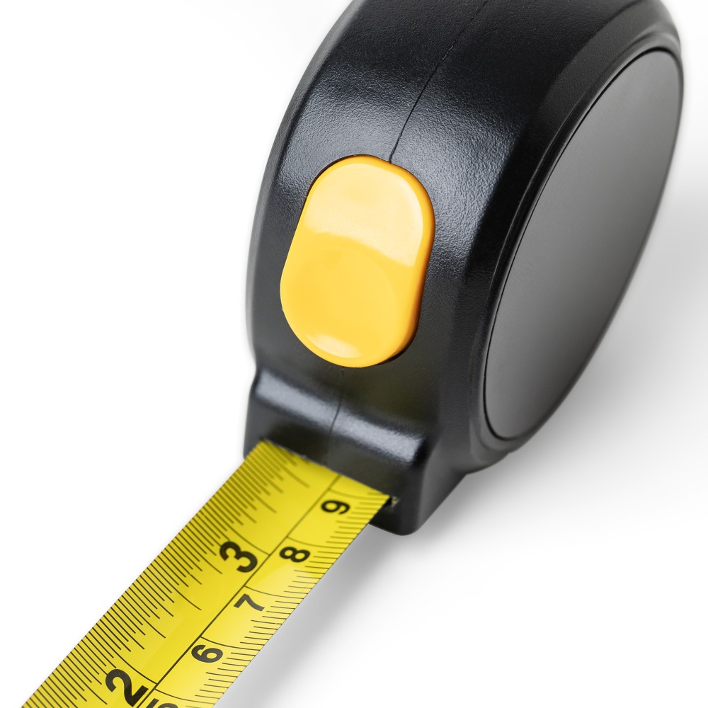ABS műanyagból készült mérőszalag mágneses oldallal, 5 m hosszúságú és 19 mm szélességű fém szalaggal, centiméter- és inch-beosztással. Felül elhelyezett nyomógomb a rögzítéshez/kioldáshoz, valamint poliészter csuklópánt. Egyenként csomagolva illusztrációval ellátott barna kartondobozban.