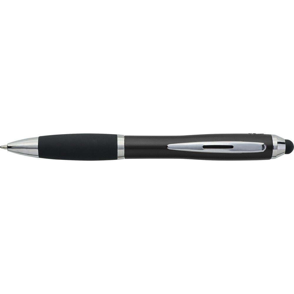 Golyóstoll egyszínű, gumírozott felületű testtel, ezüstszínű kiegészítőkkel és fekete, kapacitív érintőképernyőkhöz használható stylus véggel. Újrahasznosított ABS-ből készült. Nyomógombos szerkezettel, kék tollbetéttel és a tolltesten gravírozott újrahasznosított logóval rendelkezik.