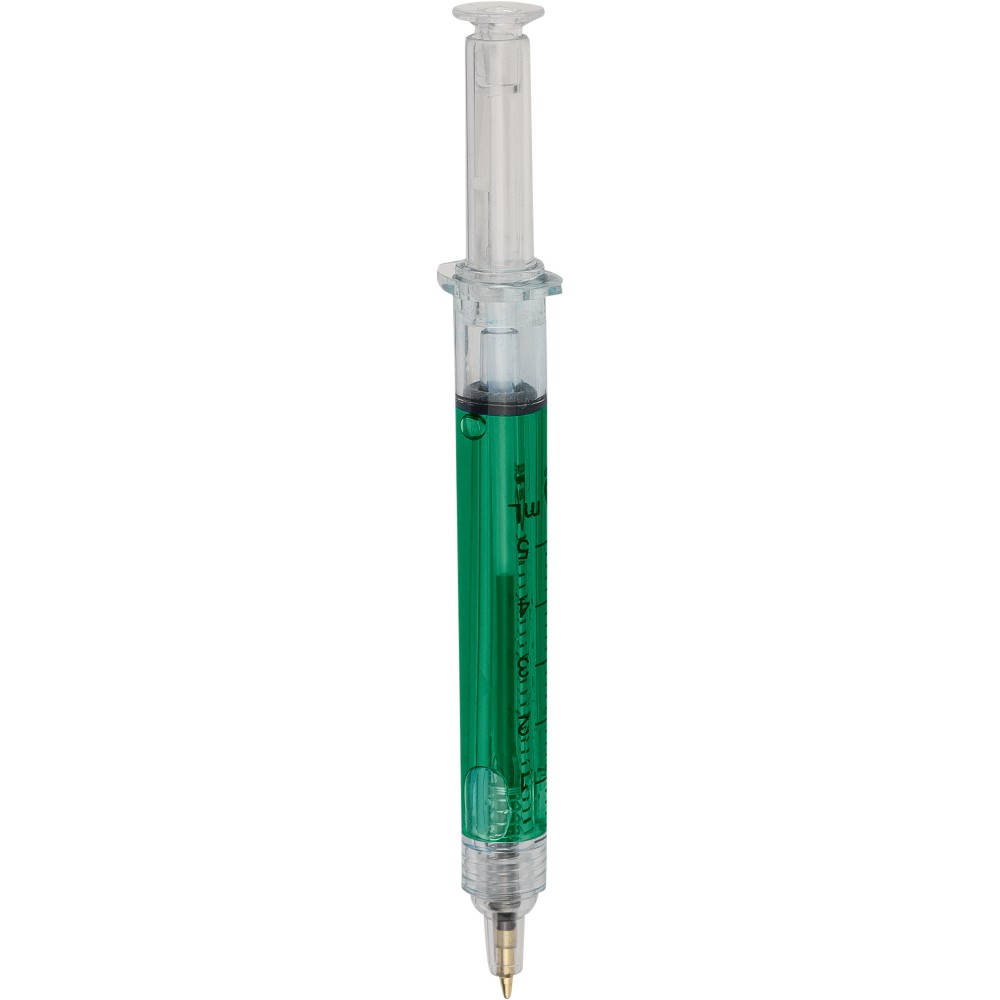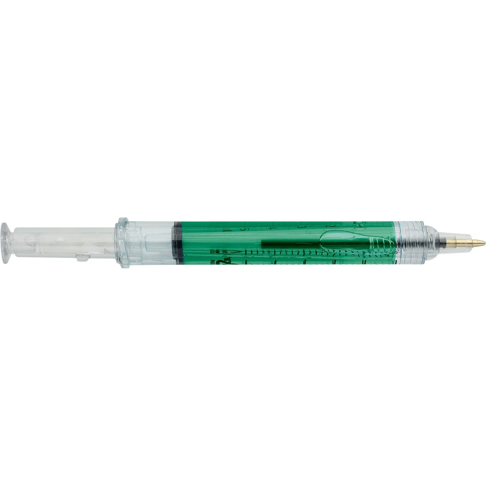 Színes folyadékkal töltött fecskendő alakú golyóstoll. Újrahasznosított ABS-ből készült, nyomógombos szerkezetű, fekete tollbetéttel szállítjuk. Érintőképernyőkhöz használható stylus véggel rendelkezik. In-mould (öntőformában elhelyezett) újrahasznosított ABS logóval díszítve.