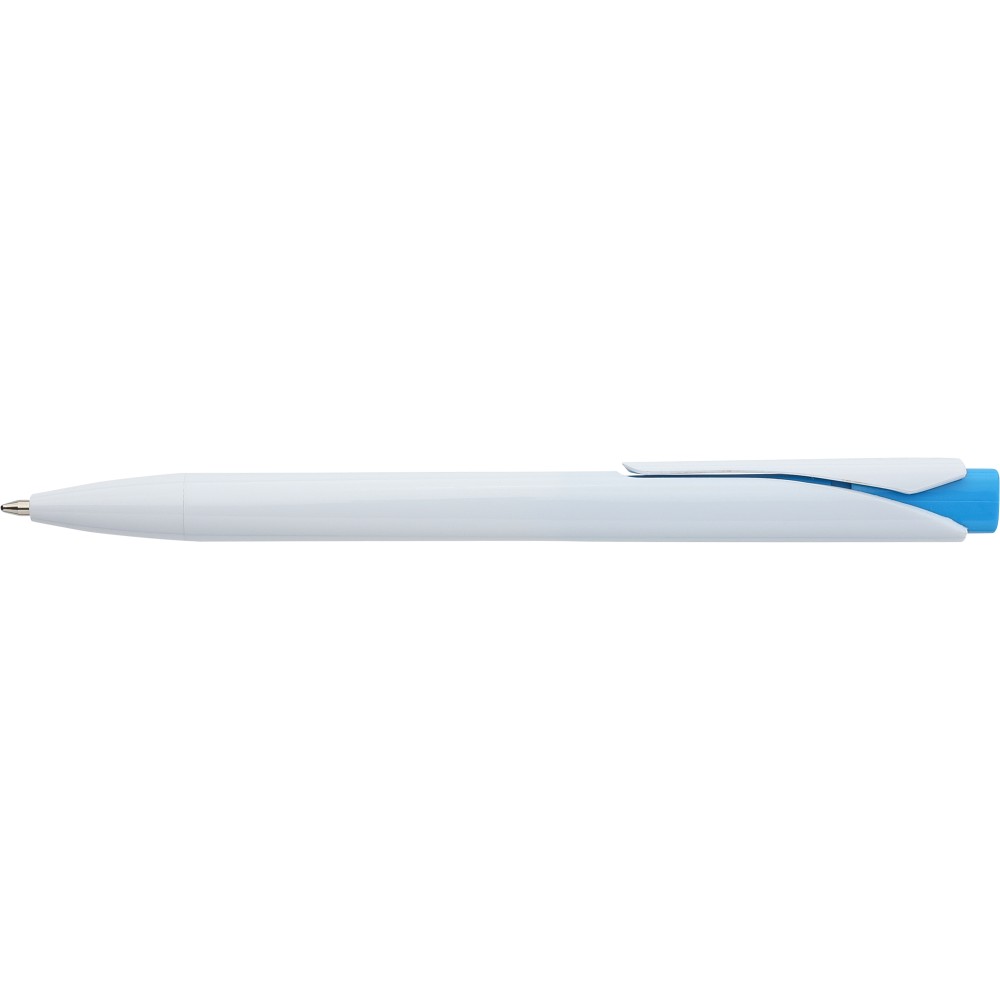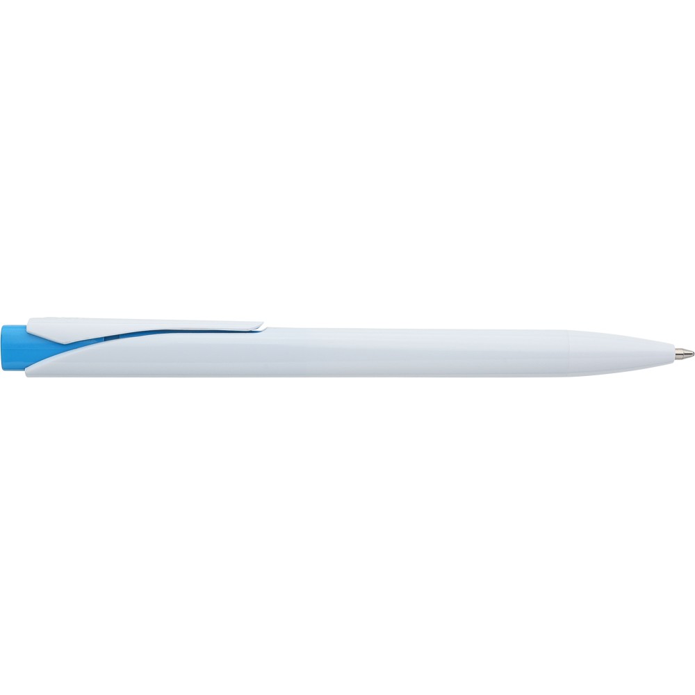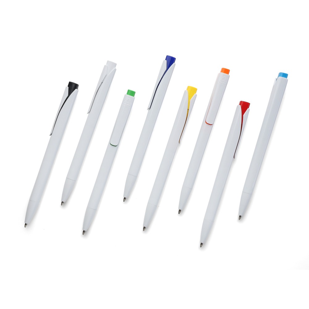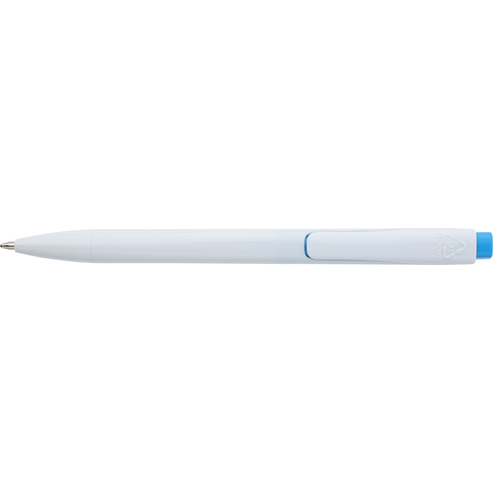 Golyóstoll tömör fehér tolltesttel és színes nyomógombbal. Újrahasznosított ABS-ből készült. Nyomógombos szerkezettel, klipsszel, valamint a nyomógomb tetején újrahasznosított ABS logóval rendelkezik. Kék színű, német Dokumental tollbetéttel, mely körülbelül 800 méter íráshosszt biztosít.