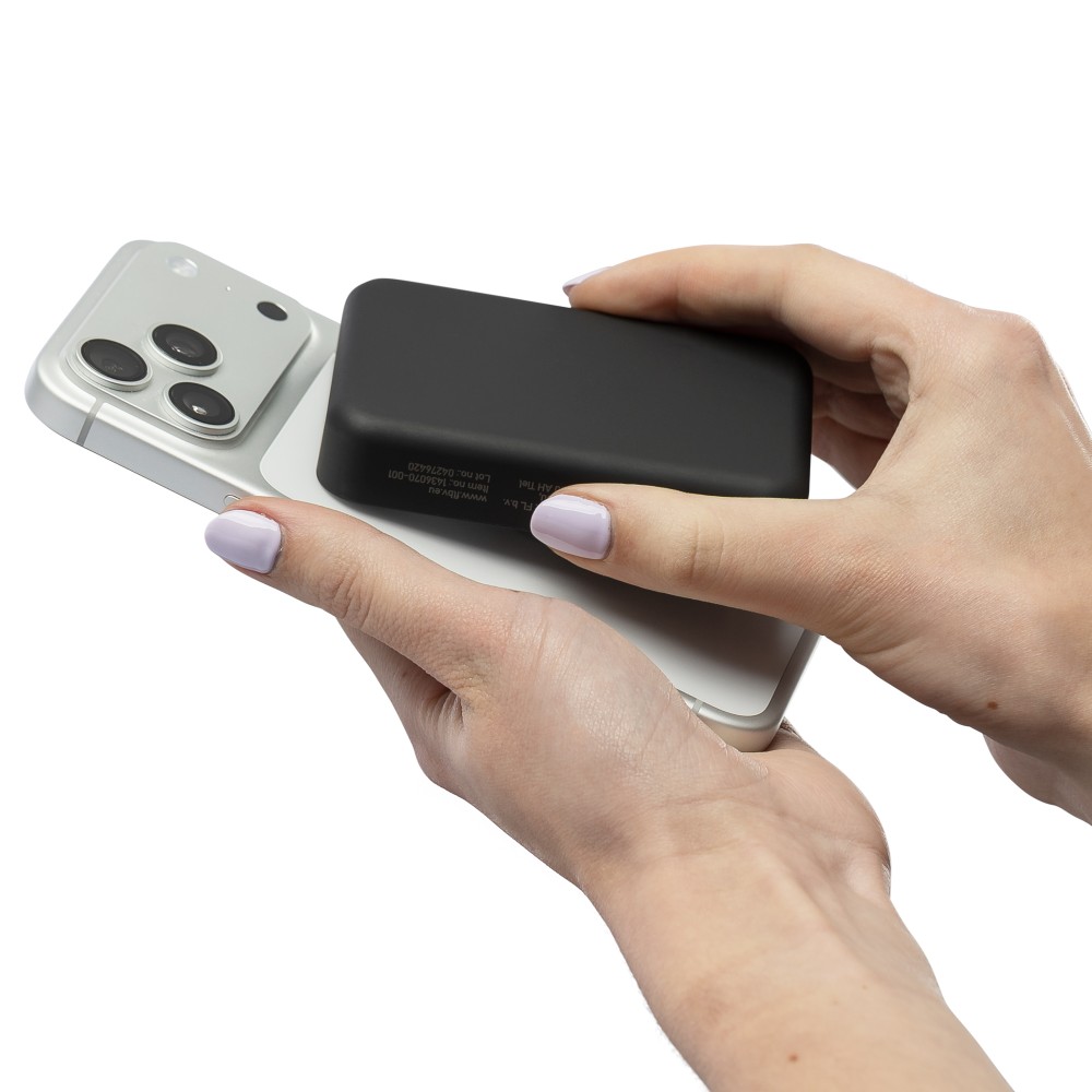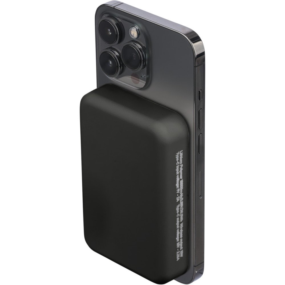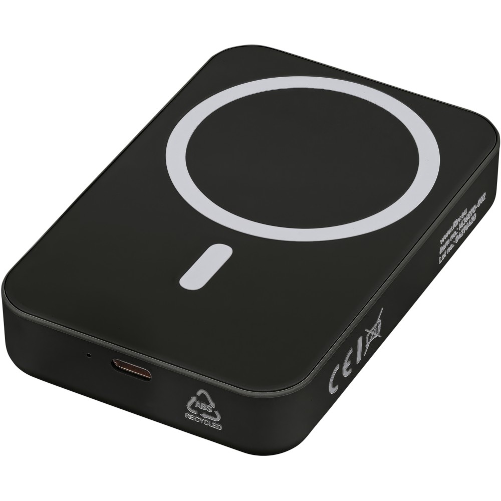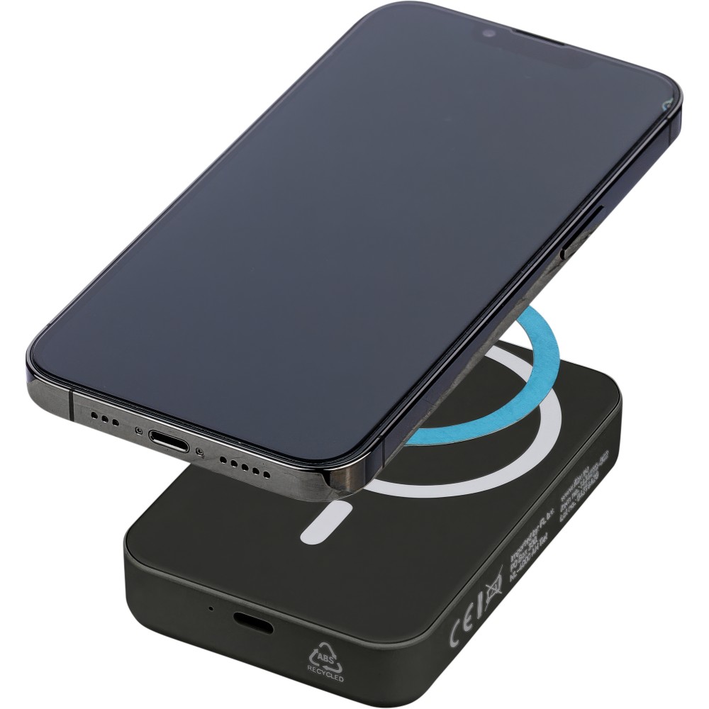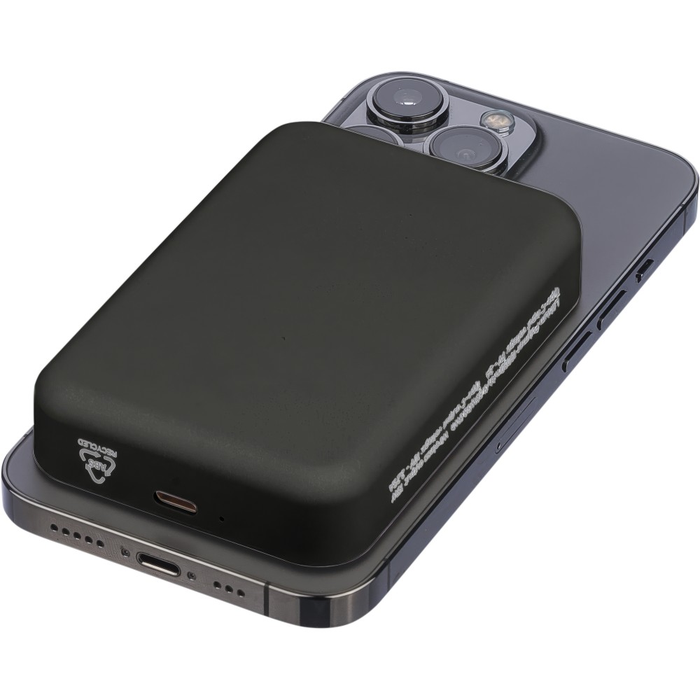 Újrahasznosított, vezeték nélküli powerbank nagy, 10 000 mAh-s kapacitással és 15 W-os vezeték nélküli töltési teljesítménnyel, MagSafe kompatibilitással. Támogatja a Type-C bemenetet és a Type-C kimenetet a hatékony töltés érdekében. A beépített biztonsági funkciók közé tartozik a túlmelegedés, rövidzárlat, túlfeszültség és túláram elleni védelem. Tartozékként egy extra fémgyűrűt és öntapadós hátlapot tartalmaz a nem MagSafe-kompatibilis eszközökkel való használathoz. Barna kartondobozba és selyempapírba csomagolva szállítjuk. Az oldalsó címke tartalmazza a termékinformációkat és az újrahasznosított ABS logót.