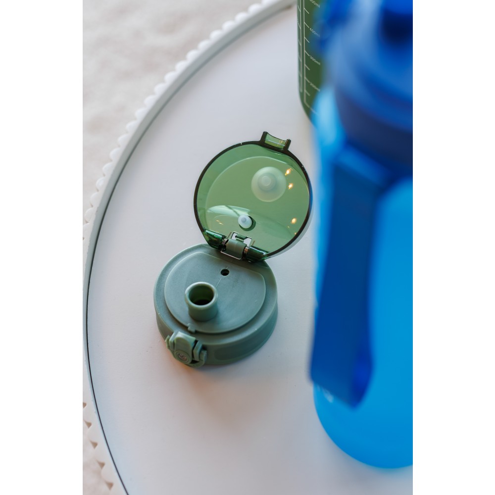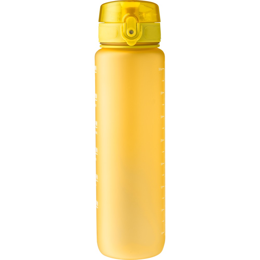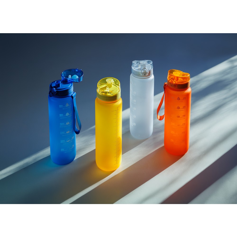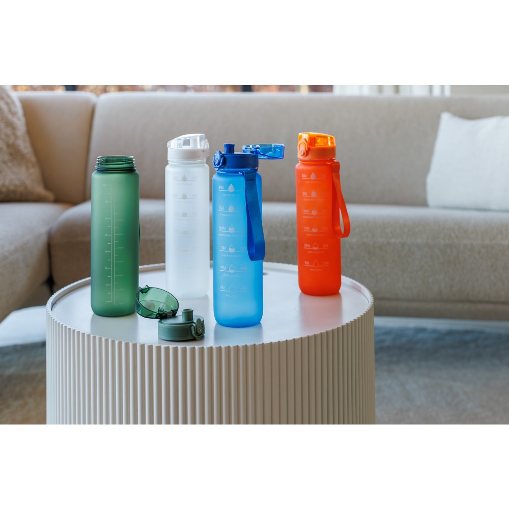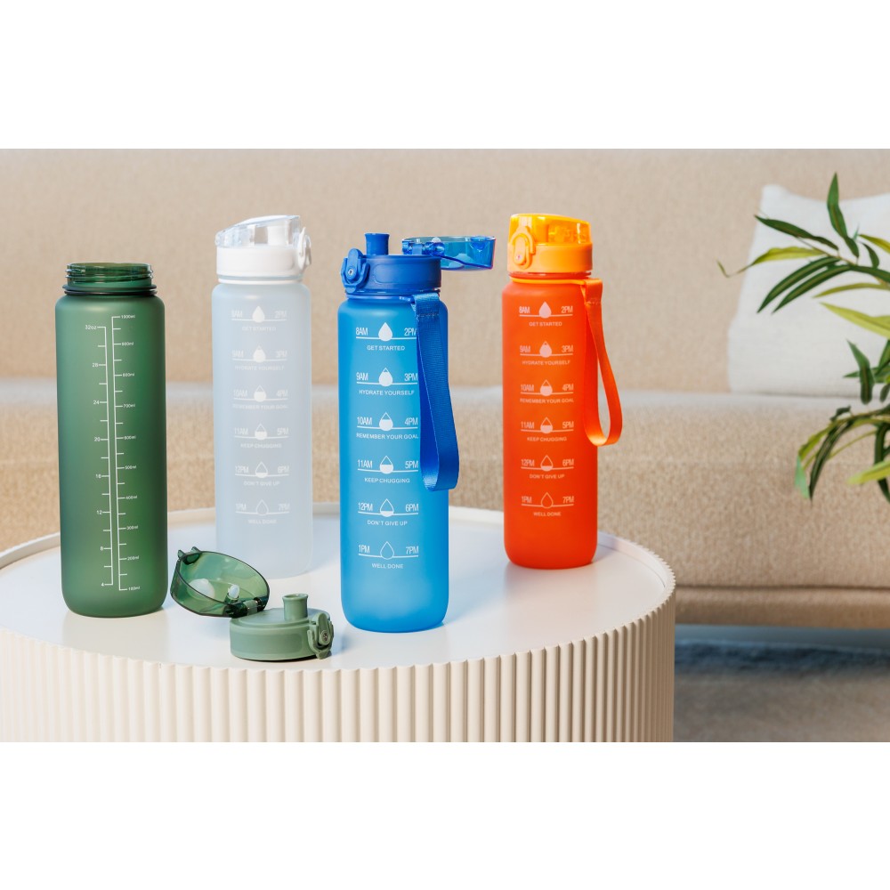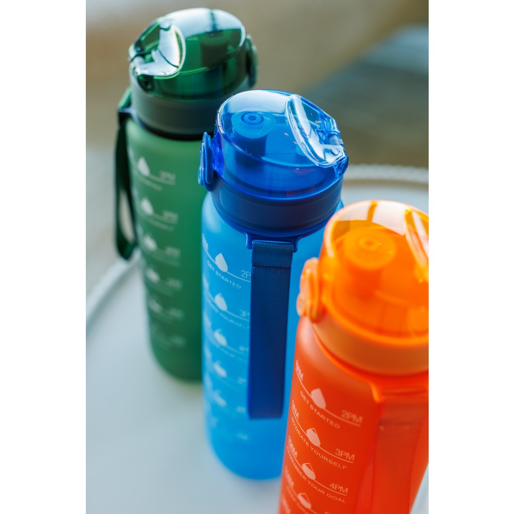 Műanyag motivációs palack szivárgásmentes kupakkal, csuklópánttal, matt bevonattal. Oldalán beosztással. Űrtartalom: 1 liter.