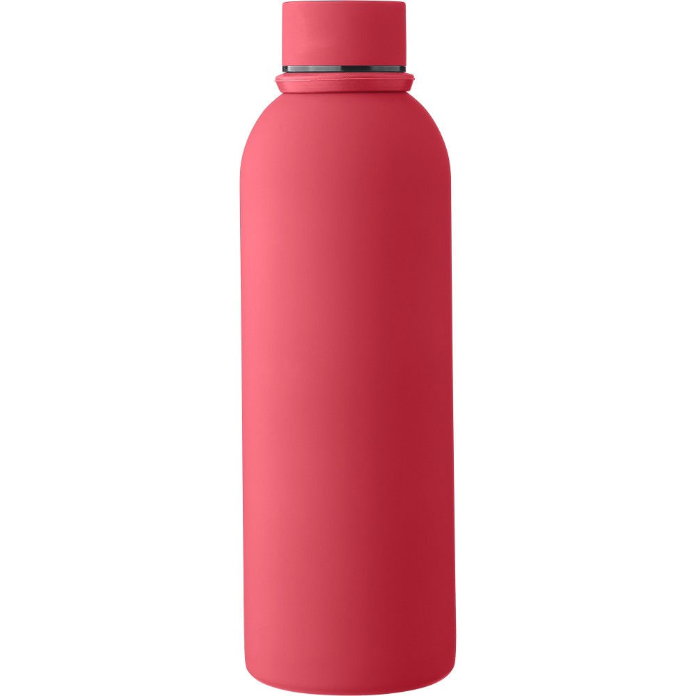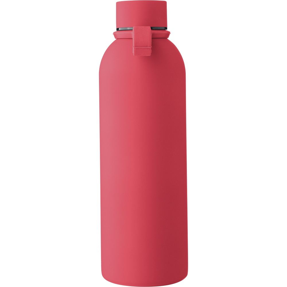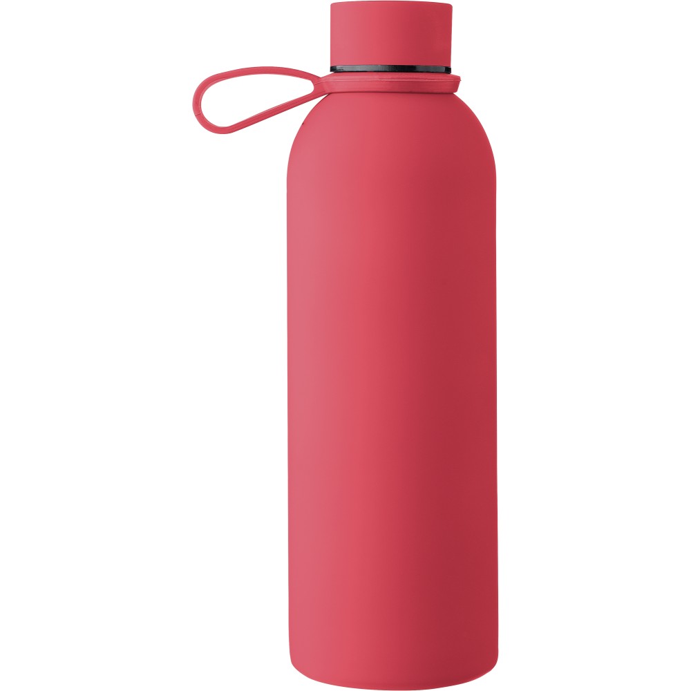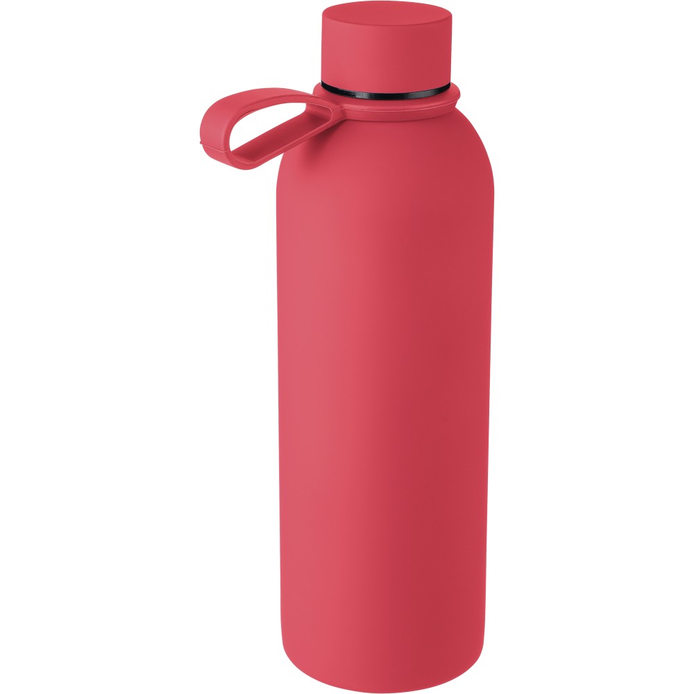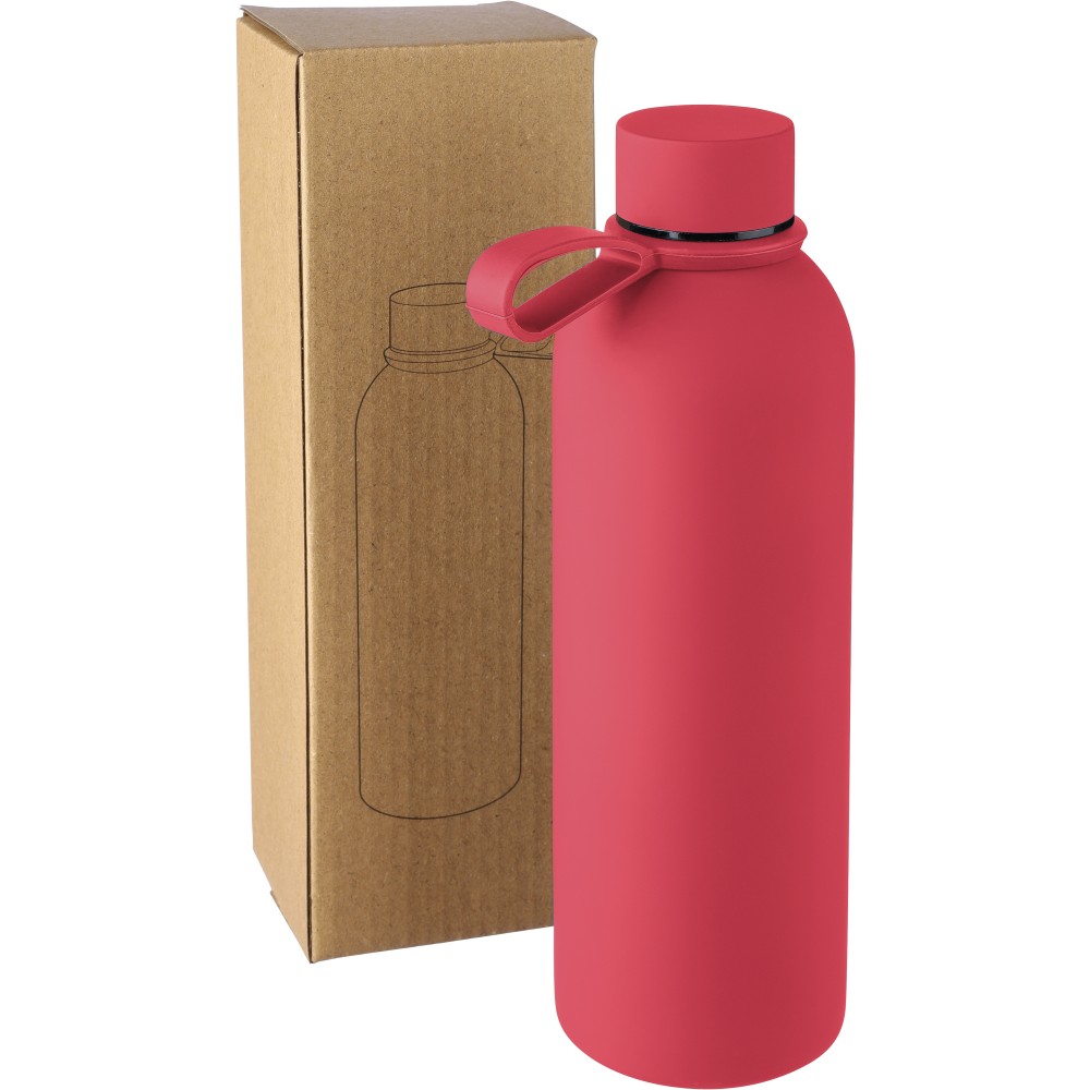 Újrahasznosított rozsdamentes acélból készült duplafalú vákuumpalack, 500 ml-es. 304-es rozsdamentes acél belsővel és 201-es rozsdamentes acél külsővel. Gumírozott felülettel, fém díszítésű csavaros PP kupakkal és szilikon hordfüllel. Gravírozott, újrahasznosított logóval. Csomagolása barna papírdoboz.