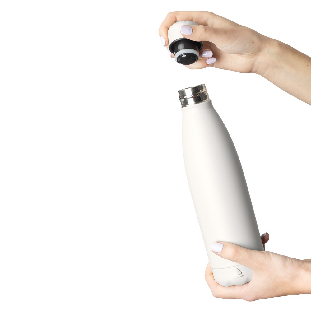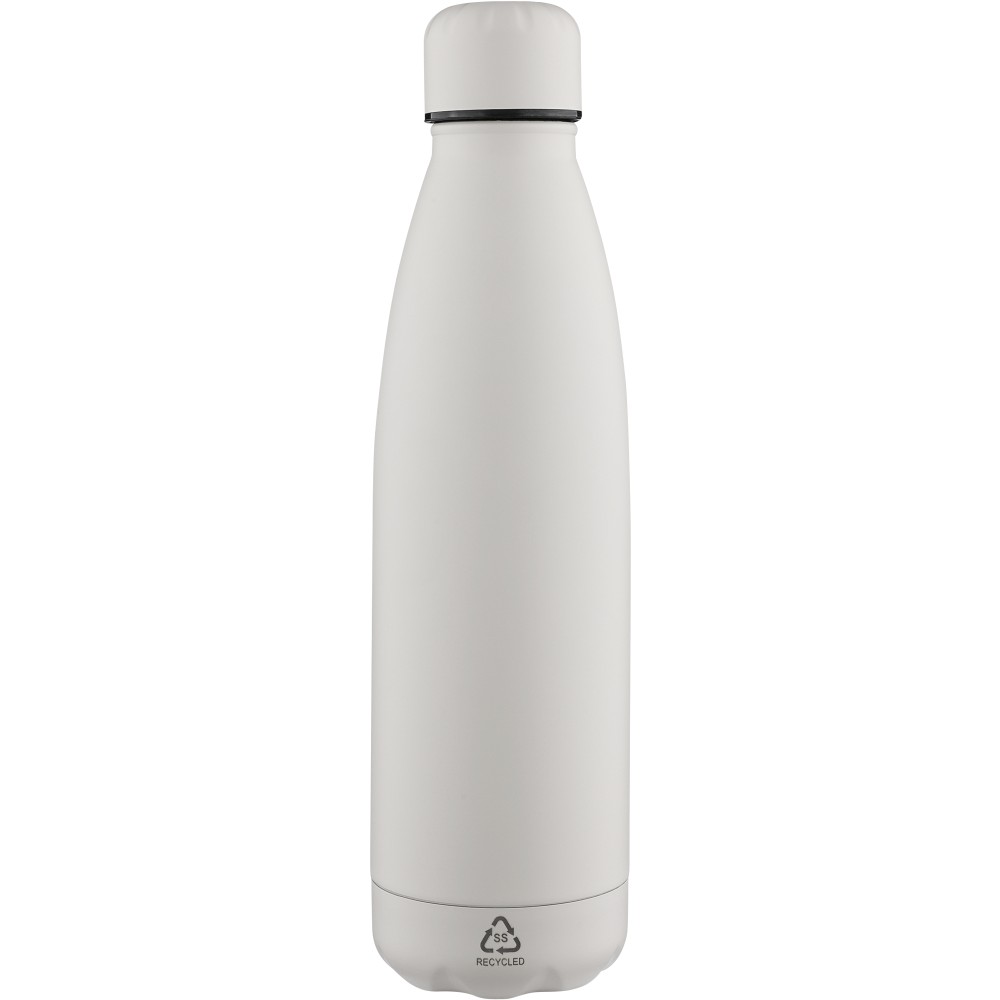 Újrahasznosított rozsdamentes acél ivópalack 500 ml-es űrtartalommal. Duplafalú szigetelés, amely akár 12 órán át melegen vagy hidegen tartja az italokat. A 304-es rozsdamentes acél belső kiváló tartósságot, rozsdaállóságot és biztonságos élelmiszer-érintkezést garantál. Selymes matt színű felülettel. A csavaros fedél és az aljzat színben egyezik a tiszta, egységes megjelenés érdekében. A palack elülső részén gravírozott újrahasznosított logó található. Egyenként, barna kartondobozba csomagolva.