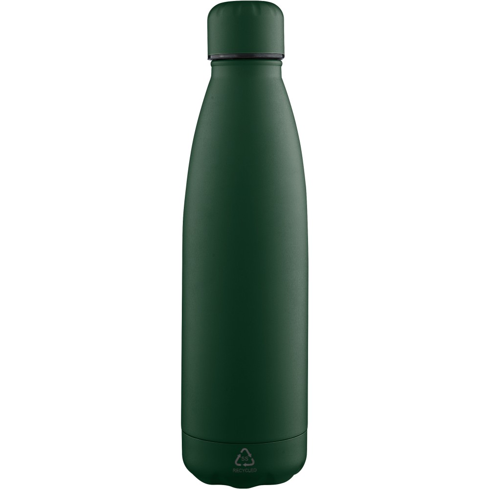 Újrahasznosított rozsdamentes acél ivópalack 500 ml-es űrtartalommal. Duplafalú szigetelés, amely akár 12 órán át melegen vagy hidegen tartja az italokat. A 304-es rozsdamentes acél belső kiváló tartósságot, rozsdaállóságot és biztonságos élelmiszer-érintkezést garantál. Selymes matt színű felülettel. A csavaros fedél és az aljzat színben egyezik a tiszta, egységes megjelenés érdekében. A palack elülső részén gravírozott újrahasznosított logó található. Egyenként, barna kartondobozba csomagolva.